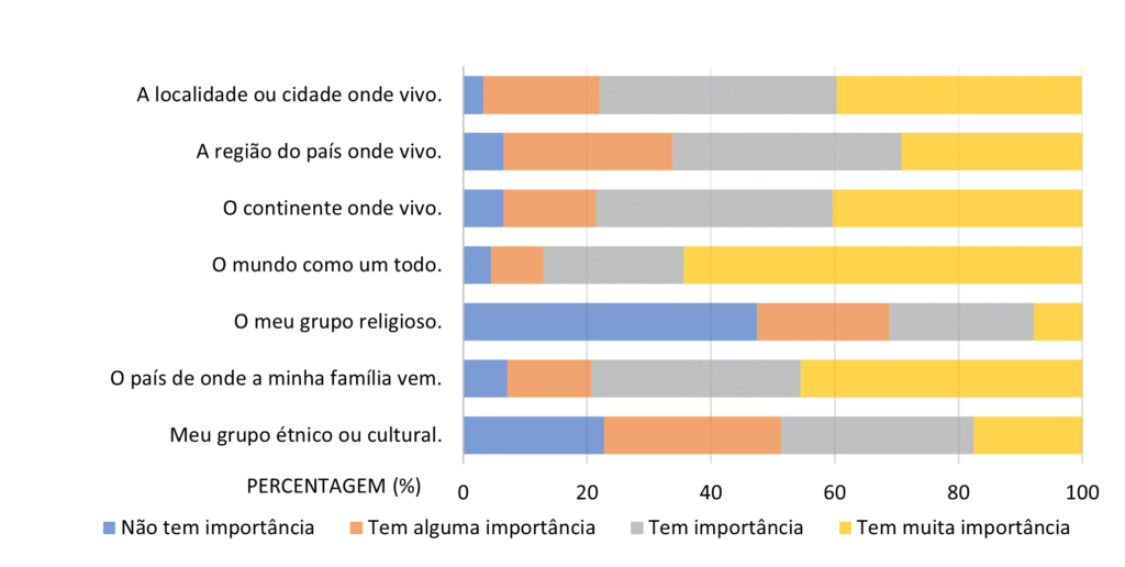 Relativamente à abertura a experiências interculturais, assinalamos que a maioria dos participantes considera que a abertura a experiências interculturais contribui para o desenvolvimento das competências globais. O mundo como um todo tem muita importância para a maioria dos participantes (64,3%) e os restantes itens também são valorizados pelos participantes. O país de origem da família, é considerado importante ou muito importante pela maioria dos participantes (92,9%).