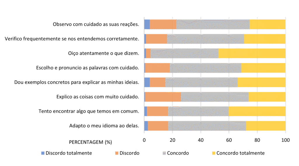Quanto à perceção sobre a diversidade na escola, a maioria dos participantes observa as reações das pessoas cuja língua materna é diferente da sua; a maioria dos participantes ouve atentamente as pessoas que falam outra língua materna diferente da sua; a maioria dos participantes escolhe pronunciar as palavras quando falam com pessoas cuja língua materna é diferente da sua. Verifica-se, ainda, que 83,2% dos participantes tentam encontrar algo em comum com a pessoa de outra cultura com quem estão a falar, enquanto os restantes não o fazem.