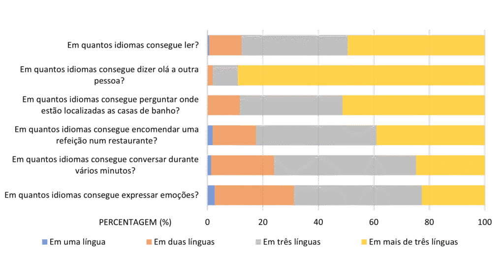 A Figura 3 apresentada a respetiva distribuição das frequências das respostas relativamente à aptidão dos participantes em línguas estrangeiras. As respostas foram classificadas a partir de uma escala ordinal de quatro categorias: “Em uma língua”, “Em duas línguas”, “Em três línguas” e “Em mais de três línguas”.