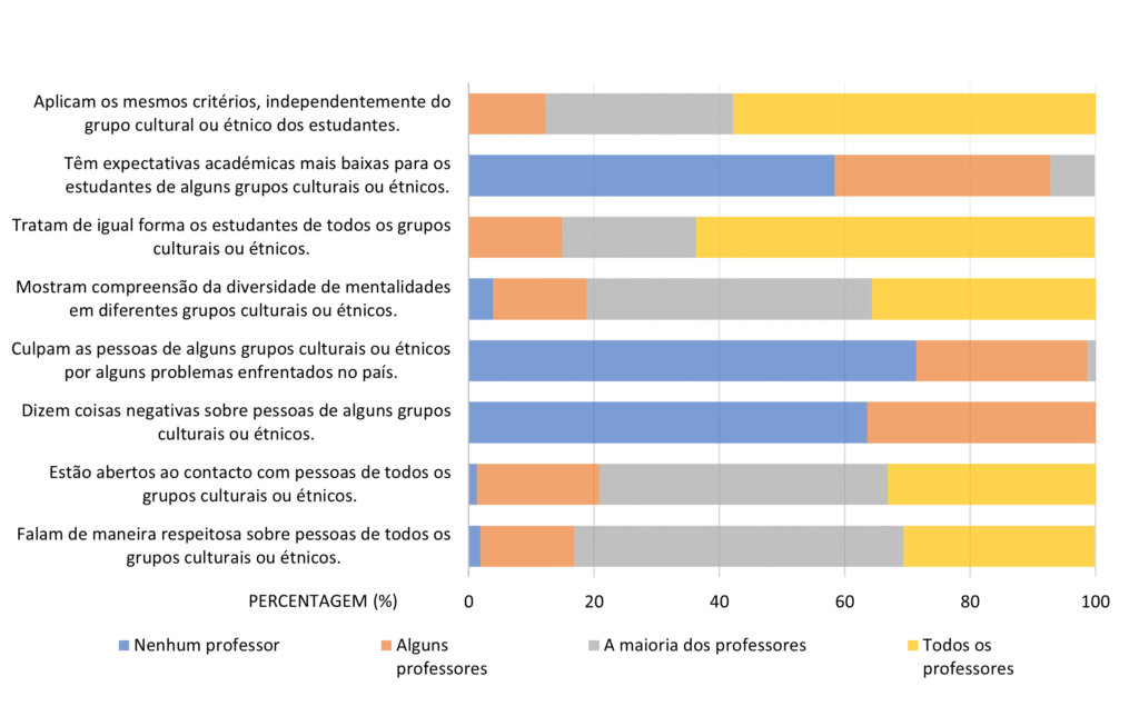 No que respeita à perceção sobre a diversidade na escola, a maioria dos alunos (57,8%) considera que quase todos ou todos os professores falam de maneira respeitosa sobre pessoas de todos os grupos culturais ou étnicos. A maioria dos alunos (79,2%) pensa que a maior parte dos professores, estão abertos ao contacto com pessoas de todos os grupos culturais ou étnicos, sendo que uma percentagem considerável (19,5%) considera que apenas alguns dos professores o fazem. A maioria (85,6%) considera que os professores tratam de igual forma os estudantes de todos os grupos culturais ou étnicos.