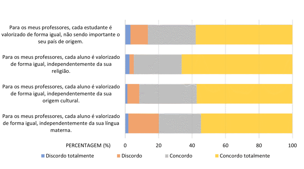 No que concerne às práticas de educação multicultural na escola, assinala-se que uma percentagem significativa de alunos (79,8%) considera que todos os seus professores, senão a maioria, valorizam os alunos de forma igual, independentemente da sua língua materna. Neste caso, 57,8% concordam totalmente que os professores valorizem de igual forma cada aluno, independentemente do seu país de origem.