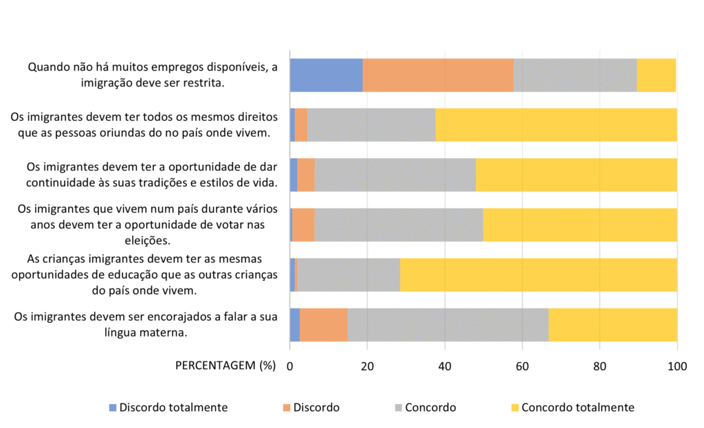 Relativamente à valorização da dignidade humana, assinala-se que a maioria dos participantes (85%) está de acordo relativamente ao encorajamento dos imigrantes falarem a sua língua materna. A maioria dos participantes está de acordo quanto ao facto de que as crianças imigrantes devam ter as mesmas oportunidades de educação que a outras crianças apresenta um valor ligeiramente mais baixo (71,4%). A maioria dos participantes (57,8%) pensa que devem existir restrições relativamente à imigração quando não há muitos empregos disponíveis.