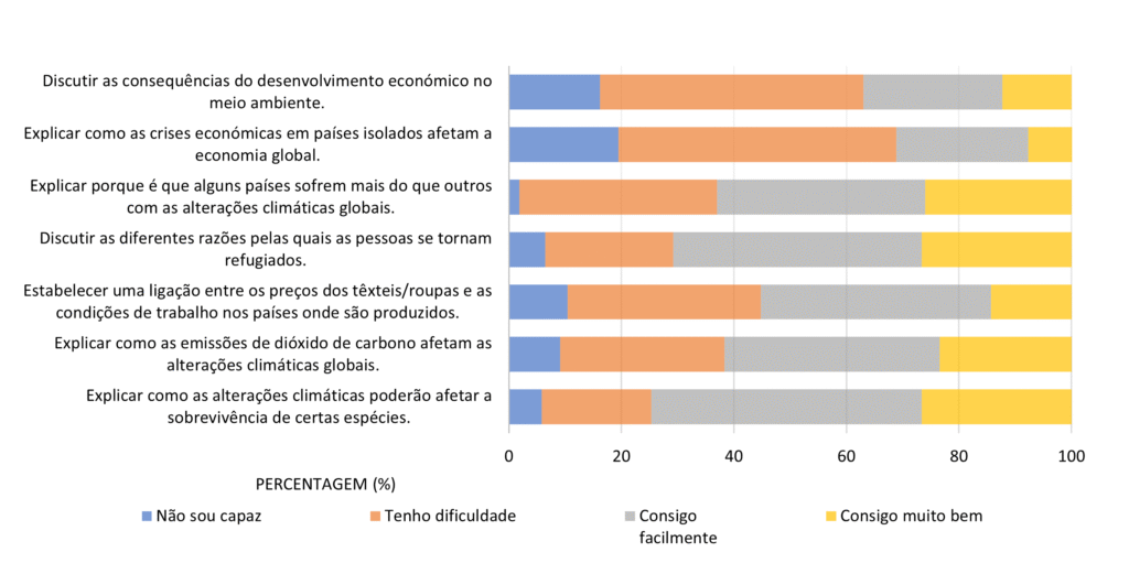 Quanto à Consciência e envolvimento em questões globais, salienta-se que a maioria dos participantes consegue explicar bem ou muito bem como as alterações climáticas poderão afetar a sobrevivência de certas espécies, sendo que, apenas 25% tem dificuldade ou não é capaz de o fazer. A maioria dos participantes (63%) tem dificuldade em discutir as consequências do desenvolvimento económico no meio ambiente.